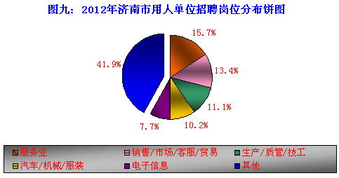 2012年服務(wù)類崗位人才需求維持去年態(tài)勢,蟬聯(lián)榜首;市場營銷類崗位人才需求保持第二;技工類及工程機械類崗位人才需求進一步增加,排名均較去年上升一位,分居第三、第四;電子信息類躋身崗位需求前十之列;其他崗位人才需求排名變化不大(圖九)。