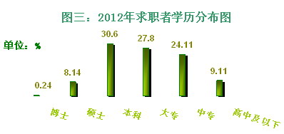 從求職者學(xué)歷構(gòu)成來看,本科占30.6%,較2011年減少1.7個百分點;大專占27.8%,求職人數(shù)較去年略有下降(圖三)。