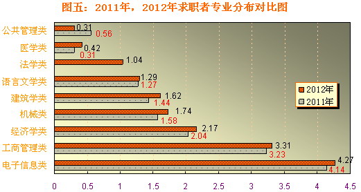 從求職者的專業(yè)構(gòu)成來看,2012年電子信息、工商管理、經(jīng)濟學(xué)、機械類專業(yè)人才逾11萬人,約占求職者總數(shù)的60%。與2011年相比,今年求職者多的前九大專業(yè)及其排名出現(xiàn)小幅變動。醫(yī)學(xué)類由去年排名第九上升至第八位;公共管理類位次較去年跌落一位,位列第九;去年未能躋身前九的法學(xué)類專業(yè)今年排名第七;藝術(shù)類專業(yè)今年未能入圍(圖五)。