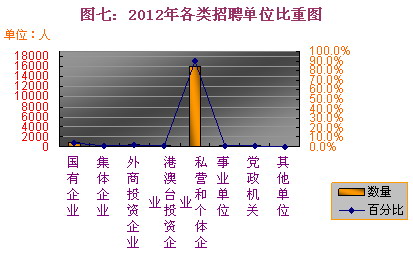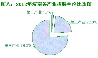 由2012年全市招聘情況看,招聘單位中隸屬第三產(chǎn)業(yè)的用人單位約14275家,獨占鰲頭;第二產(chǎn)業(yè)用人單位約4119家,位居第二;第一產(chǎn)業(yè)用人單位約326家。反映出隨著我市“轉(zhuǎn)方式,調(diào)結(jié)構(gòu)”的貫徹執(zhí)行,第三產(chǎn)業(yè)獲得了蓬勃發(fā)展。第三產(chǎn)業(yè)單位比重已近80%,為社會提供了大量的就業(yè)崗位;第二產(chǎn)業(yè)對人才需求量比重近年來一直穩(wěn)定在22%左右;第一產(chǎn)業(yè)就業(yè)趨于飽和(圖八)。