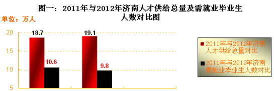 2012年濟南人才供給總量約19.1萬人,較2011年18.7余萬人略有上升;其中我市需就業(yè)的畢業(yè)生約9.8萬人,較去年10.6余萬人次有所下降(圖一);2012年各季度人才供給量均較2011年有所增長,特別是二季度增長明顯。