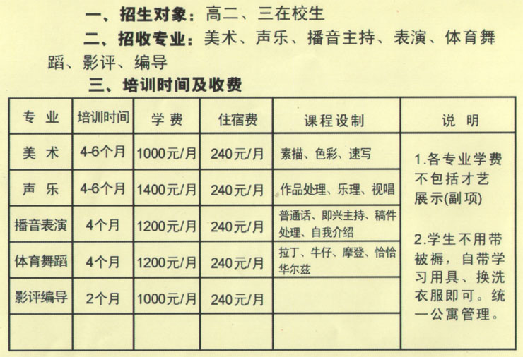 為使高三學(xué)生能順利的考入理想的大學(xué),實現(xiàn)你的人生理想,山東高端藝術(shù)職業(yè)培訓(xùn)學(xué)校2008年繼續(xù)舉辦藝術(shù)生高考培訓(xùn)。