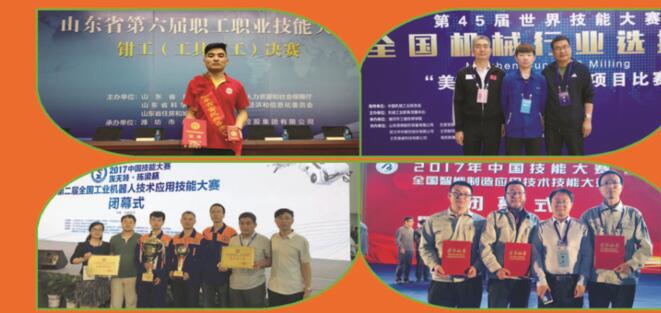 2017年在數(shù)控車、數(shù)控銑、車工、電氣安裝與調(diào)試、機電一體化、焊接技術(shù)、工業(yè)機械裝調(diào)7個工種的技能大賽中共獲得全國一等獎2個,全國二等獎2個,全國三等獎2個,山東省二三等獎、優(yōu)秀獎11個,濰坊市一二三等獎8個。2018年在第45屆世界技能大賽全國機械行業(yè)數(shù)控銑選拔賽二等獎,第二屆全國智能制造應(yīng)用技術(shù)技能大賽職工組二等獎,山東省第六屆職工職業(yè)技能競賽鉗工一等獎。