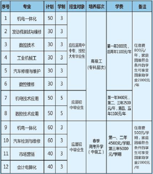 機(jī)電一體化、數(shù)控技術(shù)、工業(yè)機(jī)械工、發(fā)動(dòng)機(jī)裝試與維修、汽車修理與維護(hù)、焊接技術(shù)、 數(shù)控維修、工業(yè)控制、液壓技術(shù)、橫具制造、計(jì)算機(jī)輔助設(shè)計(jì)及應(yīng)用、智能制造、冷作加工技術(shù)、熱加工技術(shù)、市場營銷(含電子商務(wù))、工程機(jī)械修理與維護(hù)(含農(nóng)機(jī))