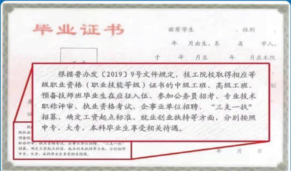 待遇優(yōu)勢:根據(jù)魯辦發(fā)【2019】9 號文件規(guī)定,技工院校取得相應等級職業(yè)資格(職業(yè)技能等級)證書的中級工班、高級工班、預備技師班畢業(yè)生在應征入伍、參加公務員招考、專業(yè)技術職稱評審、執(zhí)業(yè)資格考試、企事業(yè)單位招聘、 “三支一扶”招募、確定工資起點 標準、就業(yè)創(chuàng)業(yè)扶持等方面,分別按照中專、大專、本科畢業(yè)生享受相關待遇。