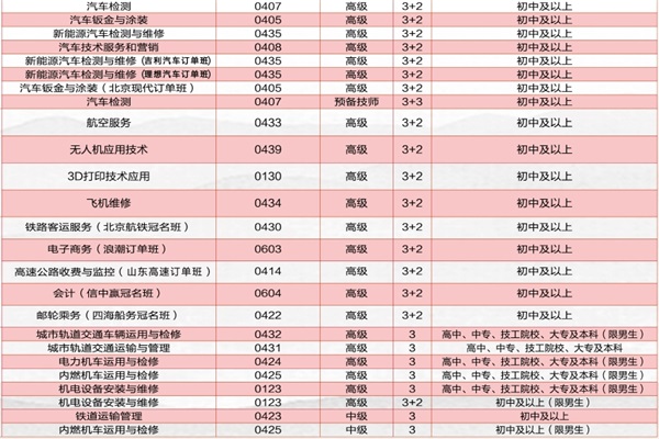 高級技工: 招收初中畢業(yè)生,學制5年(3年+2年);高中畢業(yè)生學制為3年;中技、中專及以上學歷相近專業(yè)畢業(yè)生,學制2年;