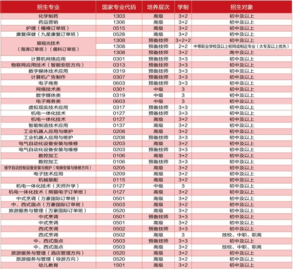 中級技工: 招收初中畢業(yè)生,學制3年:高中畢業(yè)生學制2年。