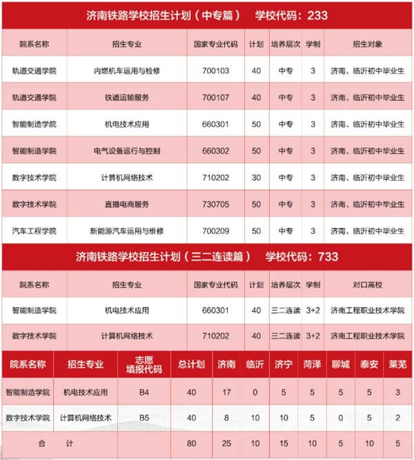 注:三二連讀計劃,前三年注冊濟南鐵路學校中專學籍,免學費;后兩年注冊濟南工程職業(yè)技術學院高職大專學籍,根據(jù)公辦院校收費標準收學費。五年全部在學校組織教學,第三年經(jīng)轉(zhuǎn)段考試合格方可注冊濟南工程職業(yè)技術學院學籍,修滿相應專業(yè)教學計劃規(guī)定的全部課程,成績合格,準予畢業(yè),頒發(fā)普通高等學校 全日制?飘厴I(yè)證書。