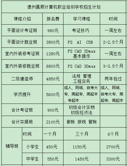 德州晨熙計(jì)算機(jī)職業(yè)培訓(xùn)學(xué)校是一家經(jīng)人社局批準(zhǔn)成立的專(zhuān)業(yè)計(jì)算機(jī)職業(yè)培訓(xùn)學(xué)校,學(xué)校開(kāi)設(shè)的專(zhuān)業(yè)有辦公軟件、平面設(shè)計(jì)、室內(nèi)外裝飾設(shè)計(jì)、會(huì)計(jì)培訓(xùn)、二級(jí)建造師培訓(xùn)、學(xué)歷提升、中小學(xué)課程全科輔導(dǎo)、中小學(xué)學(xué)習(xí)習(xí)慣及自理能力培養(yǎng)等。平面設(shè)計(jì)、室內(nèi)外裝飾設(shè)計(jì)可零基礎(chǔ)培訓(xùn),考取全國(guó)通用行業(yè)認(rèn)證證書(shū)并安置就業(yè)。建校以來(lái),晨熙已為行業(yè)輸送了大批優(yōu)秀技術(shù)人才。