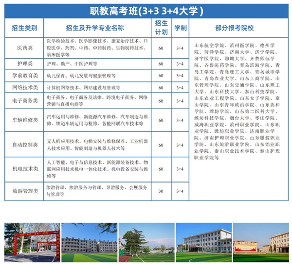 山東職業(yè)技工學校于2005年經山東省人社廳批準成立,占地面積180余畝,建筑面積5萬余平,現(xiàn)有在校生2000余人,教職工100多人,其中具有副高級專業(yè)技術職務的31人,“雙師型”教師33人,F(xiàn)開設工業(yè)機器人、無人機應用技術、消防工程技術、機電一體化專業(yè)、護理專業(yè),學前教育、酒店管理、汽車維修、網絡應用技術、電子商務等專業(yè)。學校與河北衡博高級中學合作,打造衡水模式卓毅班,開設普通高中課程,為不同基礎的同學鑄造夏季高考、高考復讀和職教高考的圓夢階梯。