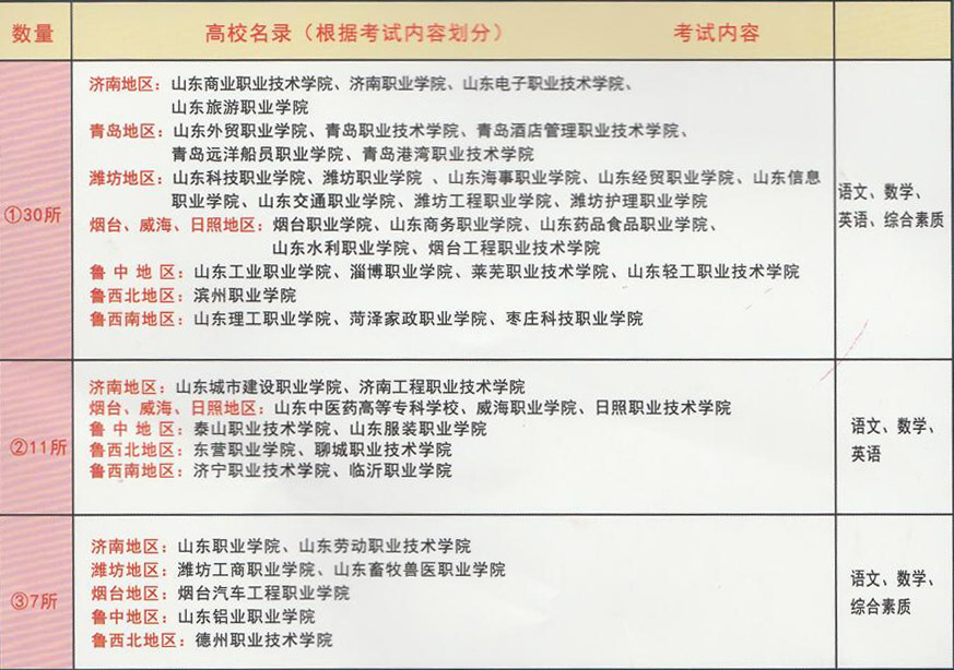 省招生考試院允許參加單招的高校都是省級(jí)示范性院校,投放的專業(yè)都是就業(yè)率有保障的專業(yè),供單招考生優(yōu)先選擇,部分高校在專業(yè)設(shè)置上優(yōu)勢明顯,例如:山東商業(yè)職業(yè)技術(shù)學(xué)院的會(huì)計(jì)和市場營銷專業(yè)屬于國家精品示范專業(yè);山東職業(yè)學(xué)院其鐵路類專業(yè)深受社會(huì)認(rèn)可;山東外貿(mào)職業(yè)學(xué)院隸屬于山東省商務(wù)廳,其商務(wù)外語類、經(jīng)貿(mào)類專業(yè)設(shè)置悠久。