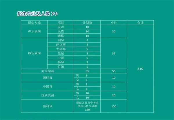 學(xué)校開設(shè)音樂、美術(shù)、舞蹈、表演專業(yè)和普通高中課程,學(xué)制三年,參加全國統(tǒng)一高考。優(yōu)秀畢業(yè)生先后考入廈門大學(xué)、天津工業(yè)大學(xué)、齊魯工業(yè)大學(xué)、山東師范大學(xué)、曲阜師范大學(xué)、濰坊學(xué)院、山東藝術(shù)學(xué)院、廣西藝術(shù)學(xué)院、新疆藝術(shù)學(xué)院等全國知名學(xué)府。學(xué)校教學(xué)設(shè)施齊全,教室配有中央空調(diào),四季恒溫。大型舞蹈室、排練廳、琴房、畫室、演藝廳、多功能電教室、圖書室、閱覽室、飯菜多樣化餐廳,設(shè)施齊全的運動場地。