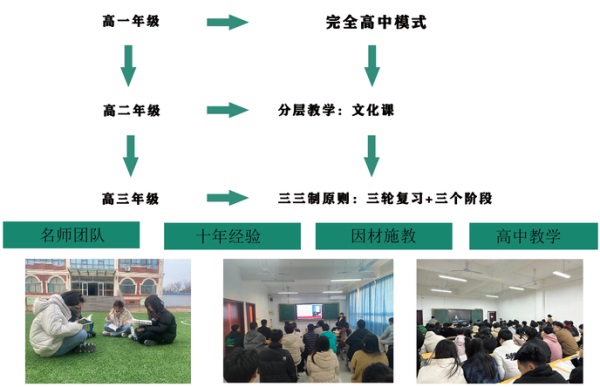 高考班分層次教學,針對學生的成績,先補課把初中語、數英基礎復習一遍。根據個別差異的學生因材施教,讓所有的學生在學習上都有所提高,全日制分班制,每班30人,教學模式采用高中授課及管理,文化課+專業(yè)理論、技能的學習,最后進行總復習沖刺。