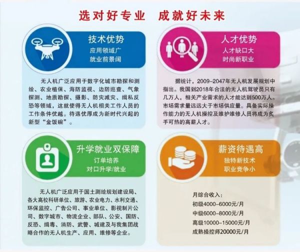 2. 就業(yè):廣泛就業(yè)在無(wú)人機(jī)航空攝影、植保、測(cè)繪、電力、維修、公安、消防等單位;政府部門(環(huán)境監(jiān)測(cè)部門、國(guó)土資源局、軍事領(lǐng)域),真正實(shí)現(xiàn)高薪就業(yè)。