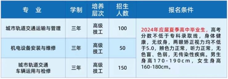 報名方式:在濟南市技師學院官網(wǎng)或關注濟南市技師學院公眾號,報名軌道交通學院城市軌道交通運輸與管理、城市軌道交通車輛運用與檢修、機電設備安裝與維修專業(yè)。2025年,將按照公司“定向定量不定人"的規(guī)定,由青島地鐵進行選拔組班,其中車站運作方向不高于65人,車輛運維方向不高于50人。